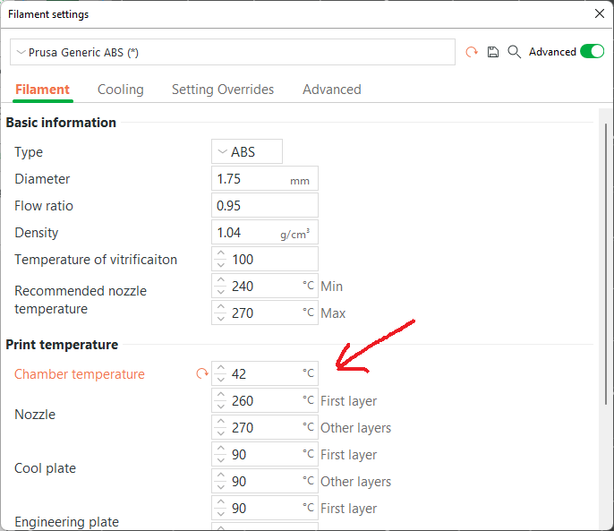 * add chamber temperature option for filament